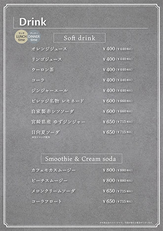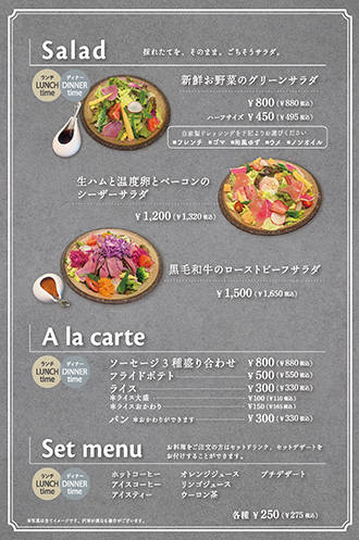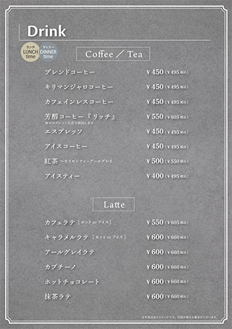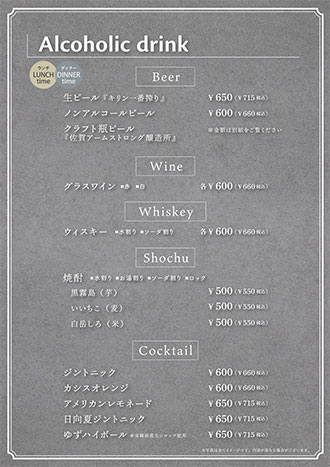 また、ディナーではオードブルやステーキなどお酒を飲みながらのメニューも豊富に揃えております。